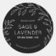 Minimalist product label template featuring botanical background motifs in black and white design with modern fonts. Create professional packaging design for your candles, wax melts, body butter, soaps or any other type of product. This fully editable round sticker allows you to customise all text, colours and layout to suit your brand.