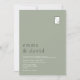 Simple, modern, minimalist, contemporary, sage green wedding invitation with monogram at the top right corner and full names at the back.