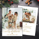 Minimalist Elegant Gold Script 2 Photo Merry Christmas Script Holiday Card. This festive, modern simple, two (2) photo holiday greeting card template featuring „Merry Christmas” text in a whimsical hand lettered whimsical swirly swash-tail font calligraphy script gold colour photo overlay. On the back side with your greeting message template with a little heart doodle and one photo template. Pretty greeting card for your family and friends in Christmas Holiday season.