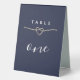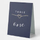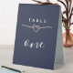 Elegant, minimalist, modern navy blue wedding table number, with gold rope heart and simple handwritten calligraphy script.