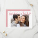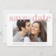 A fresh and cheerful save the date wedding announcement. "save the date" is written across the top of your favourite engagement photo in bold, clean and modern light blush pink typography, and underneath you can personalise your names, wedding date and location. On the reverse side, you can personalise your save the date information in more detail in a coordinating white typography against a light blush pink background.