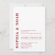 This invitation features a sophisticated white background with a minimalistic design. The names of the couple are highlighted in bold, elegant typography in red, adding a touch of modern elegance to the invitation.