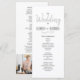 Simple, minimalist, black and white, modern script wedding program, with photo of the couple at the back.