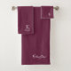 A set of minimal washcloths and towels featuring yours or your gift recipient's custom name and monogram against a Cranberry colour backdrop. If your bathroom scheme is a separate colour feel free to use the customisation function to change each washcloth and towel to your personal colour choice.