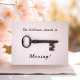 Shows an antique skeleton key over a pink background. The front text reads "The Williams family is Moving!" and can be customised. The contact information on the back can be changed to your new address. Minimal, clean, feminine design.