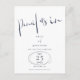 A convenient way to invite your guests to save your wedding date with handy postcards. This modern typographical design has stylilsh handwritten style navy set script Pencil Us In at the top. The word "and" in between your names is in a matching set script. Pencil like hand drawn lines roughly wrap around your date. The rest of the text can be easily personalised, which is in navy blue on a white background, with a background in white on the back with navy text. Also on the reverse are lines on which to hand write your recipients' name and address details and your return address at the bottom. You can change text and background colours to better suit your wedding colour scheme if you wish via the customise further option.
