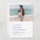 Elegant and minimal wedding save the date card featuring a simple modern all-caps periwinkle purple font over an elegant basic plain white background. The front of this invite is customisable with one of your favourite engagement pictures on top, along with your names, ceremony date, and location, while the back of the invitation is personalizable with the bride and groom's monograms.