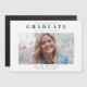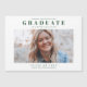 A simple, clean photo graduation announcement featuring large graduate type and student name above a landscape photo of the grad.