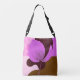 A stylish tote bag featuring a bold purple flower design with a clean and modern aesthetic.