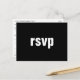 This plain RSVP postcard design features the message "rsvp" on the front. It also features a custom RSVP form on the back, along with a custom address that the completed RSVP cards would be mailed to. RSVP cards like this might be used to find out who will be attending a retirement party, a wedding anniversary party, a wedding reception, or some other event.