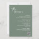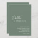 Modern olive / sage green all in one wedding invitation featuring a simple and minimal design with the bride's name in an elegant script and the groom's name in a contemporary sans serif font. Below in the lower right corner are your event details in a minimalist layout. The back has your additional details and QR Code, so you can skip the enclosure card and RSVP card.