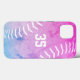 This cute girls' softball iPhone case features a minimalist softball (represented only by the ball's stitches in white) overlying a pink to blue distressed look gradient background - personalise with her jersey number - by katz_d_zynes
