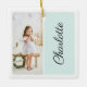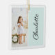 A beautiful simple, minimal and modern keepsake photo & custom name ornament to add a personalised touch to your families holiday tree. The ornament features vertical portrait photo layout with simple mint green background and personalised with name on the front and the back for you to display two photos.