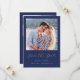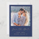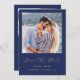 This simple, minimalist Save the Date card features a square photo above the words "Save the Date" in elegant gold-coloured handwriting script, followed by the couple's names, wedding date and city in sans serif font on a navy blue background. Add a second, horizontal photo and a more detailed message with additional information on the reverse.