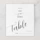Minimal and simple table number place card for your wedding featuring a modern script font that says "table" with a blank line where you can fill in the table number and the guest's name. You can add the bride and groom's names on the back.