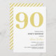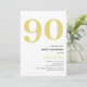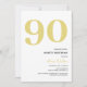 Elegant gold and white 90th birthday party invitations featuring the number '90' in a large bold serif font, and a modern invite template that is easy to personalise.