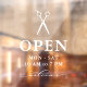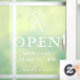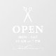 Open hours window clings for a hair salon or seamstress with a pair of scissors in white over OPEN written in elegant letters, and welcome in a swirly script. Add your opening hours. A clean, minimalist opening hours window decal for a hair salon, barbershop, or similar.