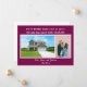 Minimalist, elegant, trendy moving announcement card with two custom photos, the names of family members, and the text "We've Moved! Come visit us soon!" + the new address and landline phone number on the front for you to personalise. Modern, chic wine red background with white writing.