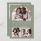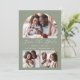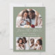 This simple, minimalist Save the Date card features a 3-photo collage, with an arch-shaped photo at the top and two smaller square photos at the bottom. In between, the words "Save the Date" appear in elegant white handwriting script, followed by the couple's names, wedding date and city in sans serif font on a sage green background. Add a fourth, horizontal photo and a more detailed message with additional information on the back.