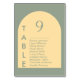 This elegant table card features a modern sage green arch design with a soft yellow background, perfect for guiding your wedding guests to their seats. The prominent 'Table 9' designation, alongside a clear list of attendees, ensures a smooth and organised reception. The minimalist aesthetic and calming colour palette create a sophisticated ambiance for your special day, making it easy for guests to find their designated spots without confusion. This design offers a beautiful blend of functionality and style for any wedding theme.