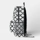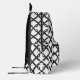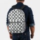 The backpack features a minimalist black and white design. The pattern consists of interlocking geometric shapes that resemble a chain or net. The overall effect is sleek, modern, and sophisticated.