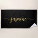 Girly Feminine Minimalist Simple Clean Black And Gold Monogram Name Signature Script Custom Personalised Summer Beach Towel. This design featuring your first name in a pretty hand lettered style swash tail font signature typography (or calligraphy) on black and gold background. These are easy to customise it. Great stylish feminine housewarming gift, also for birthday, mother’s day, wedding, sweet 16 birthday party, bachelorette party, bridal shower, for graduation party and It’s for the girl who likes simple clean things.