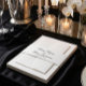 This design features a stark, sophisticated contrast between deep, formal black ink and a pristine, clean white background, embodying the essence of a modern classic aesthetic. At the center, the couple's names are presented in a sweeping, traditional black script that evokes a sense of timeless elegance without unnecessary flourishes. Below the names, the wedding date is anchored in a structured, serif font, providing a balanced, architectural look to the layout. The entire design utilizes flat printed ink to maintain a smooth, matte finish, ensuring the text remains sharp and legible. The overall visual effect is one of understated luxury, perfectly suited for wrapping around a black-tie invitation suite to create a cohesive, monochrome presentation.