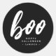 Black and white "Boo" halloween sticker in minimalist typography style. Personalize with name. Great for halloween party or treat label.