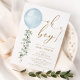 This elegant baby shower invitation features soft sage green eucalyptus, watercolor blue balloon and modern typography.