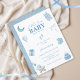 The design showcases a charming mix of denim-inspired details and soft, dreamy touches, including a baby pram, baby footprints, a delicate blue bow, baby jumpsuit, and a whimsical moon—all in soothing shades of blue. The invitation proudly declares, "A blue jean BABY is on the way!", setting the tone for a joyful and stylish celebration.