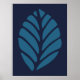 A minimalist modern art silhouette drawing of a leaf in fall in a teal blue color with a dark navy blue background.