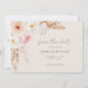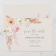 A minimalist boho wedding save the date cards featuring watercolor white peonies, soft peach roses and pampas grass floral bouquet on an ivory cream colour background.