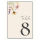 Wedding table number featuring minimalist typography design and boho wildflower floral illustration background.