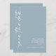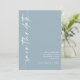 Minimalist Calligraphy QR Code Dusty Blue Wedding. Available digitally and printed. Optional QR code to your wedding website on the back which will be automatically generated when you change the sample url to your own website url or delete sample code if not required. Stylish set calligraphy is rotated to the left hand side, with all the details stylishly to the right with lots of white space for a contemporary feel. Easily personalise with your details. And change the colour of text and background if you wish via the edit further option.