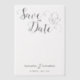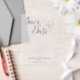 At the heart of the design, the words "Save the Date" are elegantly written in flowing, graceful calligraphy. The script is fluid, with delicate curves and a slight flourish that echoes both the modern and the classic. The choice of font is sophisticated and timeless, giving a sense of glamour while maintaining the invitation’s understated beauty.
