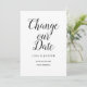 This minimalist black and white change our date card features an elegant script with your details set in modern typography. The reverse has additional details, including your website, with your return address and space for your recipient's address. Designed by Thisisnotme©