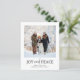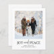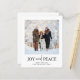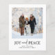 This simple and elegant black and white holiday budget Christmas card features your personal photo on the front, with a mix of modern handwritten script and bold serif text that says "Joy and Peace". There is room for an additional personal message on the back.
