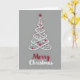 Beneath the tree, the words "Merry Christmas" are written in red cursive and white block letters, adding a festive touch. Shadows under the ribbons and ornaments create depth in the image. Overall, the card blends traditional holiday symbols with a contemporary feel, creating a serene and stylish atmosphere.