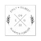 Simple and minimalist wedding self-inking stamp featuring your initials and wedding date in a modern sans serif typeface and arranged in a crossed X design. There are editable text placeholders on the top and bottom of the cross-X containing your names and "Always & Forever" in the same typeface. There are symmetrical botanical branches line art to further accent the design. Easily personalise this design to match your style by clicking "Customise" to go to the design tool and adding your own custom text or details.