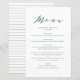 Customisable script menu card featuring elegant script, simple typography and stripes pattern. This script menu card is perfect for any wedding theme and season. Personalise by adding names, date and menu details.