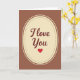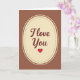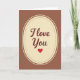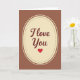 This card shows a tall cream-coloured oval centred on a chocolate-brown background, giving it a cosy, classic look. Inside the oval, the words “I Love You” appear in smooth, flowing cursive lettering in a deep maroon colour. A neat double border frames the oval, with a ring of tiny brown dots just inside a thin solid brown line. Beneath the words sits a single red heart, simple and bright, like a little reminder of what you’re trying to say ❤️. The warm browns and soft cream make the heart and message feel even more tender and focused. It’s the kind of design that feels steady and sincere, which can matter when you want your feelings to land without a lot of extra fuss. Giving this card says you care in a direct, comforting way, whether it’s for romance or a close friendship 🥰. Hope it helps you share your Valentine’s Day feelings in a way that’s easy and heartfelt.