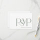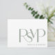 The simple 5" x 3.5" wedding RSVP response cards feature the word, RSVP in large script letters in dusty sage on white. The back has placeholders with lines for the guest to fill their name and to select their choice for attending.