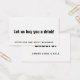 Treat your wedding reception guests to a cocktail or two with the help of these simple drink tickets. All text is rendered in simple, basic fonts that are fully editable: change my wording, colours, and the fonts if you prefer. The card has been set up with this text and phrases: on the front is "Let us buy you a drink!" and "Good for One Adult Beverage". On the back is "Cheers!" and a placeholder for your names. Just use the template fields to customise the cards with your personal details and click to customise more, if you'd like to change more than the copy. All type is black and the background is white... which can be changed to any colour you prefer. // Designed by Melody Watson for Paper Muserie.