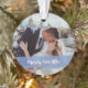 Minimalist, elegant "Merrily Ever After" Our First Christmas personalised photo Christmas ornament for newlyweds, with modern cursive typography / hand lettering on a stylish semitransparent blue band and a frame of white and silver snowflakes and little stars. Make sure you personalise at least the two photos (front and back), and the first and last names (you can put Mr. and Mrs. Last Name there if you wish) and year on the back.