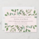 This trendy wedding invitation features a frame of abundant watercolor green leaves and a few tiny berries on a soft, blush pink background. The back of the invitation also says "Wedding" in elegant calligraphy.