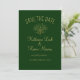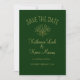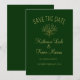 This is a simple minimalist style save the date wedding invitation in dark forest green and with a text in beige colour and a simple leaves bouquet.