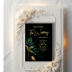This wedding card features an elegant, minimalist design with a black background and gold text, creating a sophisticated and formal aesthetic. The script and serif fonts are used in a balanced composition, giving it a modern yet classic feel. The bottom left corner is adorned with botanical illustrations in shades of green and gold, adding a touch of nature and luxury to the overall design. The layout is clean and organised, ensuring that the important details of the wedding are clearly communicated. Personalise the card with your names and details of the wedding. You can download the card to your mobile device or computer. Card was created with the help of ai.