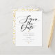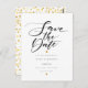 This minimalist save the date card features two gold hearts and an elegant script save the date above your details set in elegant typography. The reverse features gold hearts confetti. Designed by Thisisnotme©