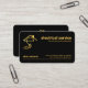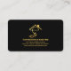 An all black cover is accentuated by a faux gold line near the base of the card. ; Here lies your prestigious name and the contact details. Near the top is a gold "letter-e home bulb power plug" logo you can use with the business name and a slogan option at the opposite end of the card. The letter-e can represent "electrician" or possibly your own prestigious name.