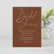 This invitation effortlessly combines simplicity and grace, focusing on the captivating interplay of metallic tones against the rich, warm backdrop of cinnamon brown. The centerpiece of the design is the "Bridal Shower" script, exquisitely rendered in shimmering gold. The gold script adds a touch of opulence and sets the tone for a celebration of love and refinement. Surrounding details, elegantly scripted in both gold and silver, further enhance the invitation's luxurious appeal.